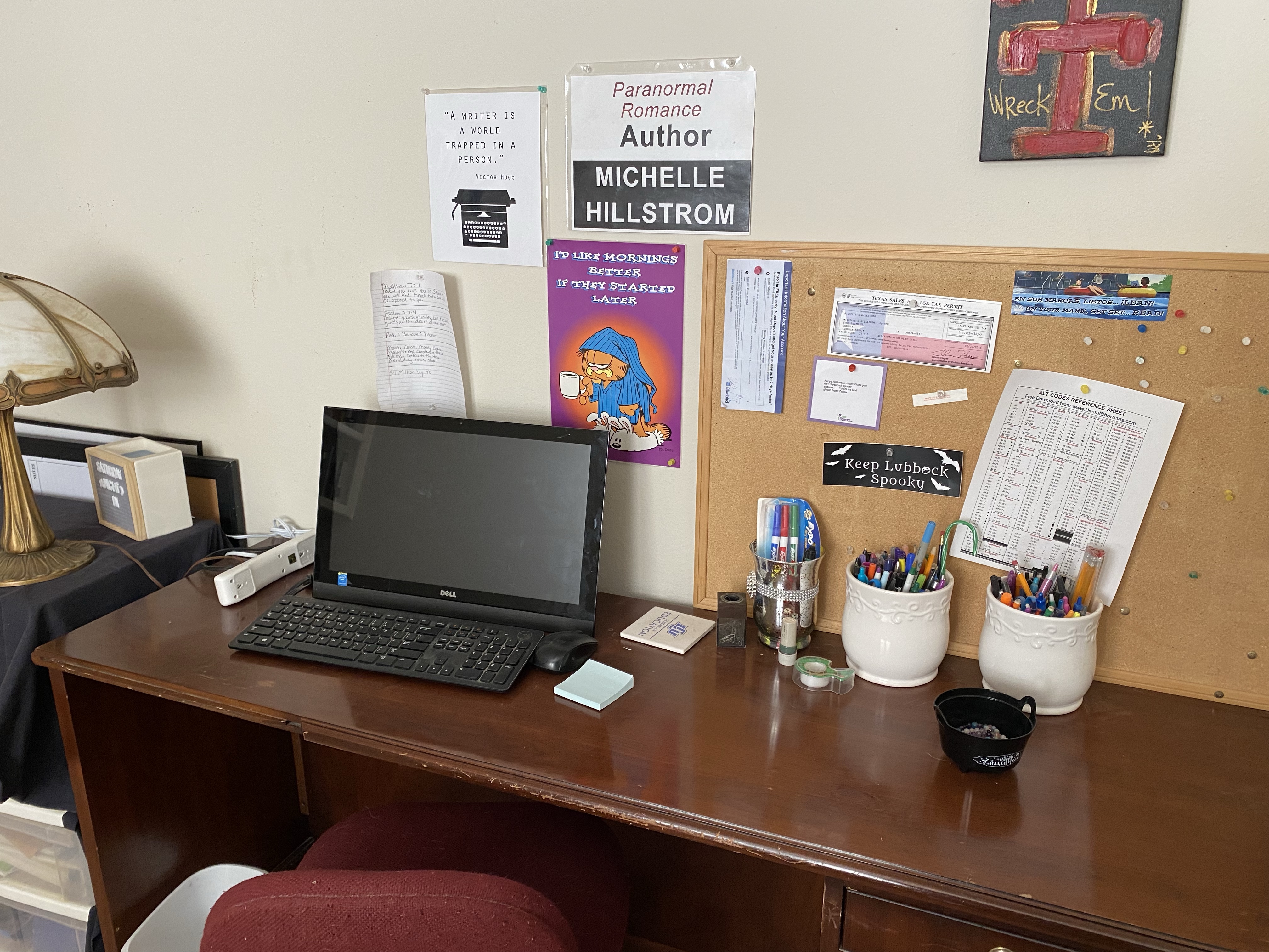 My physical writing cave/office is still new and is still a work in progress. It’s a spare bedroom that I am still in the process of converting into my writing cave. I got my desk for a steal off the LetItGo app. I’ve got a corkboard, a dry erase calendar, and physical paper calendar to help keep me organized with my book releases, newsletters, blog posts, social media posts, and my author friends’ book releases. Candles, pens, notebooks, books, boxes of merchandise for conventions, printer, printer paper… you know your typical office essentials. My next investment for my writing cave is a good Executive Desk Chair. Long hours spent sitting bent over the keyboard requires a comfy chair. TRUST ME. A good chair is essential! The chair I have in there now is an old one from my dad’s old trucking and transportation business… and it’s not very comfortable.